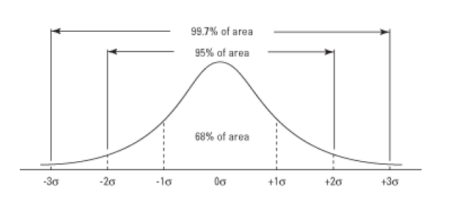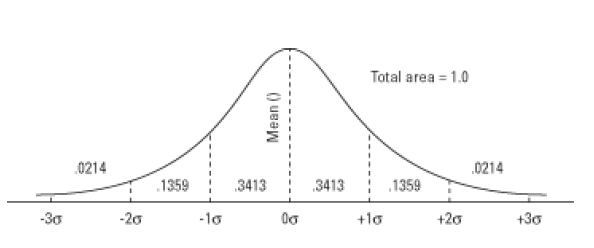 Sections of the curve above and below the mean may be added together to find the probability of obtaining a value within (plus or minus) a given number of standard deviations of the mean (see Figure 2). For example, the amount of curve area between one standard deviation above the mean and one standard deviation below is 0.3413 + 0.3413 = 0.6826, which means that approximately 68.26 percent of the values lie in that range. Similarly, about 95 percent of the values lie within two standard deviations of the mean, and 99.7 percent of the values lie within three standard deviations.